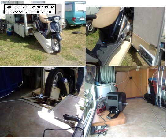 Lo scooter entra a marcia indietro trainato da un verricello elettrico su una pedana di legno e un carrellino che ha anche la funzione di bloccare la ruota posteriore dello scooter.