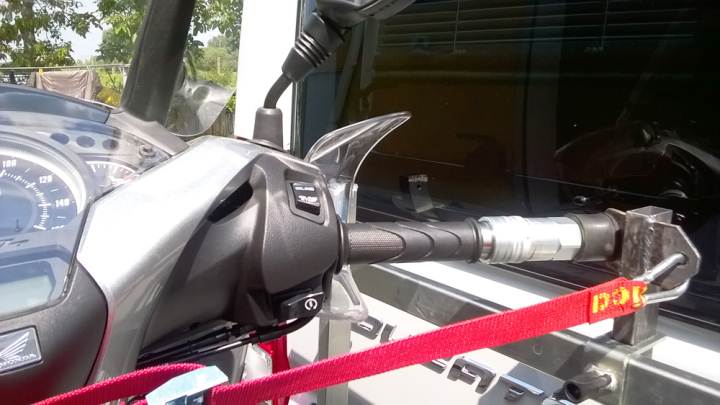 A questo punto dopo che ho fatto salire lo scooter dalla rampa mi basta infilare l’attacco rapido e con un semplice clik il manubrio è già fissato, aggiungo anche la cinghia originale solo per ulteriore sicurezza lasciandola lenta per evitare che si rompa il pulsante delle frecce.