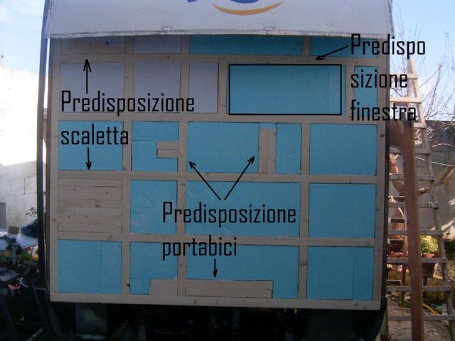 Ho cominciato a ricostruire la parete inserendo dei rinforzi per il portabici e scaletta anche se per il momento non ho intenzione di montarli, come si vede dalle foto ho predisposto anche una eventuale finestra più piccola, ho proceduto con l’incollaggio della lamiera d’alluminio che è stata la spesa più alta (circa 300,00 euro) e poi ho rimontato il tutto.