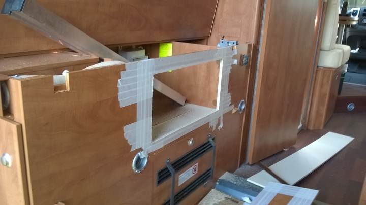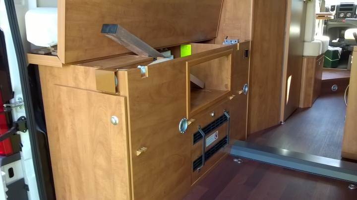 Il Malibu 600 ha un vano laterale sotto al letto che è accessibile solo sollevando il letto, con conseguente necessità di rifare il letto tutte le volte, ho quindi deciso di realizzare una apertura per rendere accessibile il vano mantenendo il letto in posizione, occorre un po di manualità nel lavorare il legno un seghetto alternativo, colla vinilica, nastro adesivo e una cornice angolare color ciliegio per ripristinare i bordi dell'apertura tagliata.