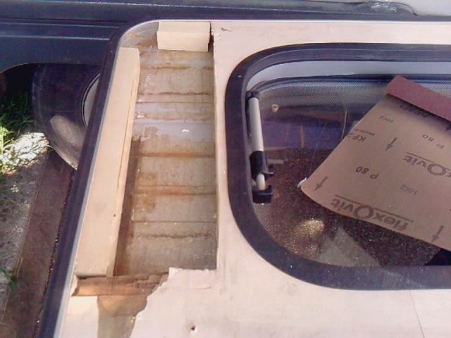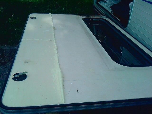 questa estate prima di partire in ferie mi accorsi che avevo problemi di infiltrazione d'acqua sul mio portellone del gavone del camper, per cui la parte interna dell'inbottitura era ormai marcia (foto 1), non mi restava altro di rimboccarmi le maniche e provare a sistemare il danno. Ho evitato di andare da un carozziere per camper, il cui danno ammontava di € 500. La prima cosa che feci guardai di cosa era fatta l'imbottitura la quale era formata da uno strato di polistirolo e uno di compensato, il quale ricopriva la parte esterna all'interno del portellone stesso andai in un negozio del fai da te e comprai il materiale: 6 fogli di polistirolo espanso 1000x500x20, un foglio di compensato grezzo, decisi di prenderlo da10mm di spessore perchè quello che c'era sù era di 2 mm, in modo da rendere il portellone più resistente agli agenti atmosferici. Presi 2 tipi di colla professionale, 1 per incollare il poristirolo all'alluminio, dato che la parte esterna del portellone era formato da un sottile strato di alluminio e 1 per incollare il compensato al polistirolo e infine del sigillante in silicone e la schiuma espansa. E infine presi 3 rotoli in PVC color noce chiaro per ricoprire il compensato grezzo. Il tutto con una spesa di € 70.