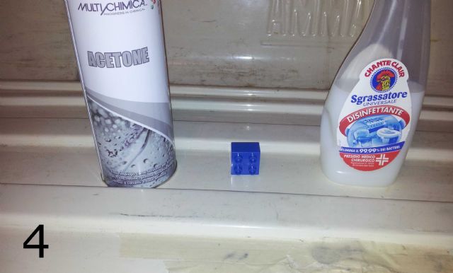Foto 4: materiali usati per ripararlo (mattoncini Lego gentilmente dati da mio figlio per una causa comune), Acetone comprato in negozio di ferramenta e sgrassatore.