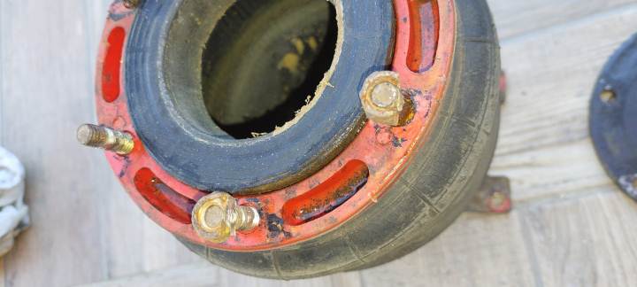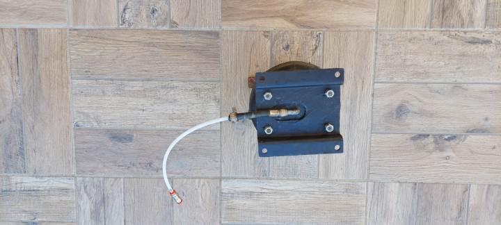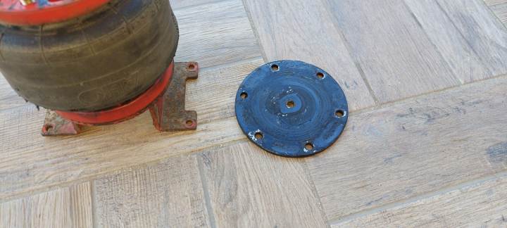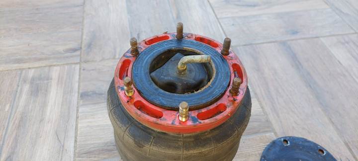 Per il soffietto sx. ho usato lo stesso procedimento per smontaggio, gonfiaggio e immersione in bacinella piena d’acqua. Il risultato è stato drastico: perdita dalla flangia superiore e dalla gomma del soffietto con piccole crepe laterali. A primo impatto pensavo non si potesse riparare, comunque l'ho aperto con la stessa procedura del primo, ho sistemato la flangia per la pulizia e verniciatura, ho inserito una camera d’aria misura 3.00/3.50 - quelle che si trovano nelle ruote dei carrelli porta pacchi, hanno la valvola in metallo a squadra perfetta, che passa nel foro della flangia - ho inserito la camera d’aria all’interno del soffietto e ho rimontato la flangia. Da un gommista ho acquistato una prolunga morbida per ruote gemellari di camion, l’ho avvitata nella valvola della camera d’aria e la ho tranciata all’altra estremità, ho inserito il tubo rilsan stringendo con una fascetta metallica - prova a immersione in bacinella: nessuna perdita, perfetto. Infine ho rimontato il soffietto nel suo alloggio. Per il fissaggio inferiore al posto delle staffe U-Bolt, ho usato barre filettate e piastre preforate.