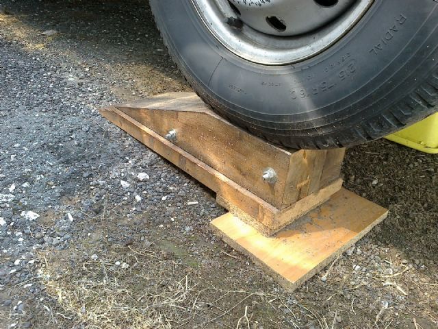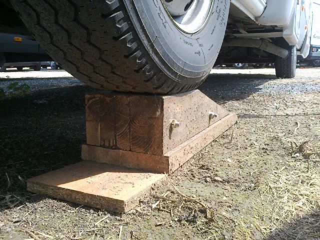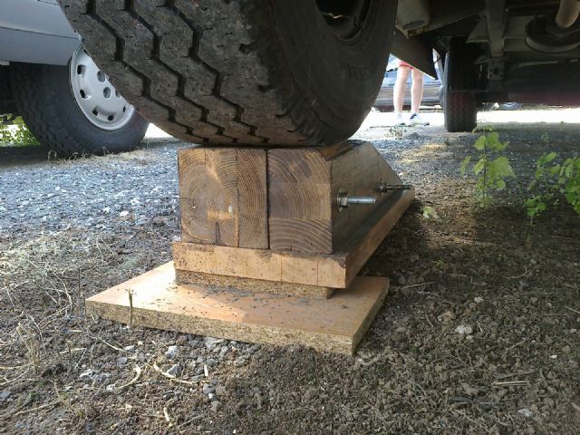Ho sostituito i cunei in plastica deformati per il peso del mezzo fermo in rimessaggio con questi cunei assemblati con pezzi di legno di scarto tenuti insieme tramite una barra filettata con dadi e rondelle.