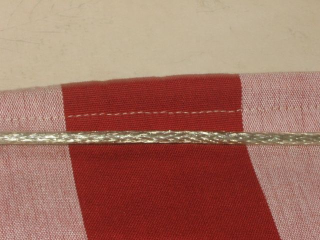 Acquistato cavo per stendibiancheria diam. 5 mm e inserito nel bordo superiore della stoffa, in precedenza tagliata su misura, e cucito in modo tale che non si possa sfilare, perchè servirà ad infilare le tendine nel profilato delle finestre. La signora ha provveduto alle varie finiture di orli, elastico nell’angolo inferiore, ecc. ecc.