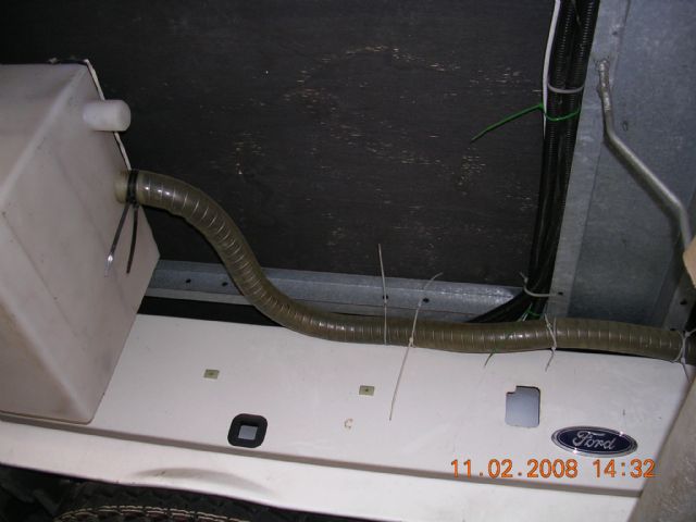 Ho comprato un tubo da circa 40 mm, lungo un metro. Poi ho tagliato un pezzettino di portagomma sul serbatoio (della doccia e del bagno) ed ho collegato il tubo. Ho poi altrettanto fatto con il serbatoio della cucina, cosicchè quando uno dei due serbatoi si riempie per primo, va a travasare nell'altro. In questo modo, il veicolo ha un'autonomia maggiore.