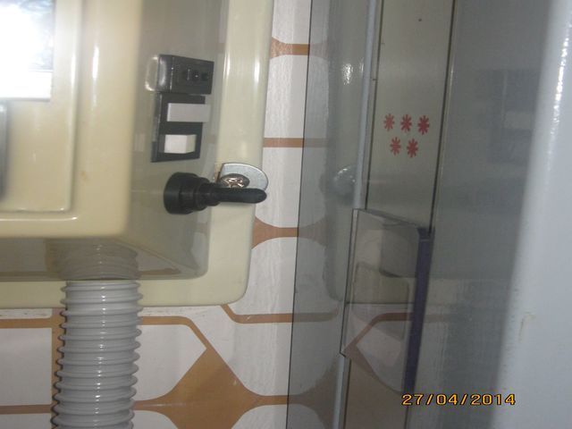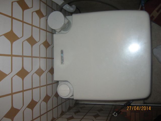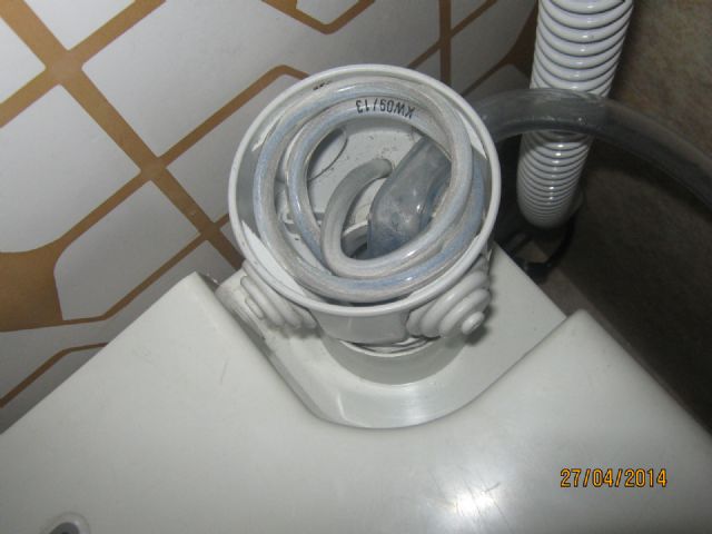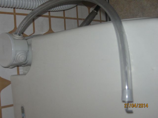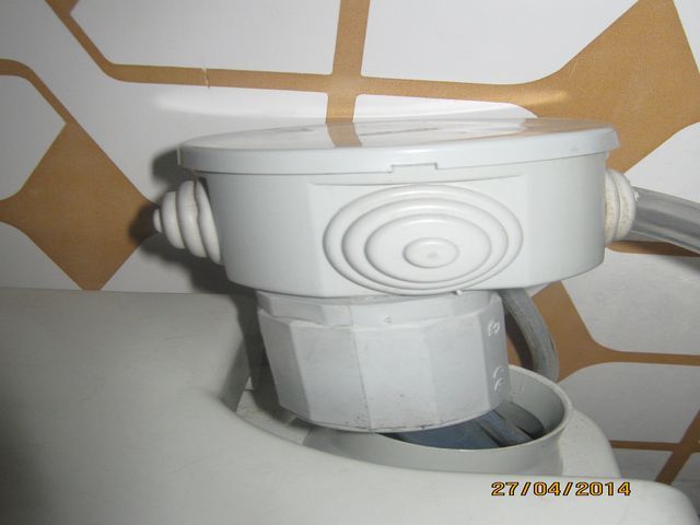 Con il filo elettrico sono passato nel bagno stesso, per prendere corrente dalla specchiera. Fare un buco nella parete, per poi rifarne un'altro per andare alla specchiera non mi sembrava tanto furbo: è a vista, ovviamente protetto da tubo, ma mi sembra la soluzione più comoda, economica e veloce; inoltre, se si vuole tornare al Porta Potti originale, basta cavare questo tubo col filo, e rimettere il tappo nel serbatoio di carico del water. Rimarranno solo 1/2 buchi delle viti dei porta tubi.