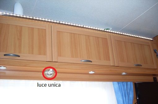 Di sera ho visto che l'interno del camper era poco illuminato, avendo una sola luce dalla parte della dinette ed una nella parte del divanetto. Sono quindi andato da Ikea ed ho comprato varie luci a led ed alzatine per cucine di casa.