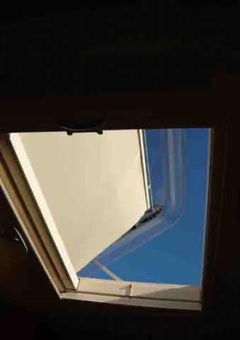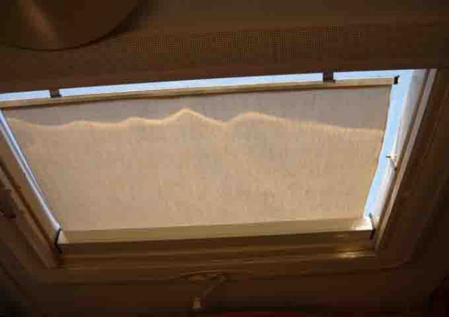 Avendo inoltre un oblò grande, il sole la fa sempre da padrone: chiudendo l'oscurante non passa l'aria, tenendolo aperto ci si abbronza, ho pensato così di creare una tenda su misura che sia con l'oblò aperto, sia con l'oblò chiuso mi eliminasse il riflesso e l'aria potesse circolare.