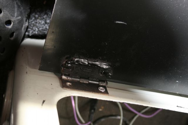 Sulla lastra ho applicato 2 cerniere con la saldatrice e un chiavistello con lucchetto. le cerniere verranno in seguito fissate nella parte inferiore del basamento del sedile, mentre sul lato superiore ho messo il blocco del chiavistello, il tutto con dei rivetti.