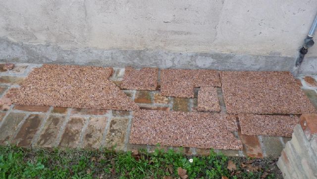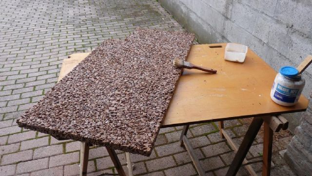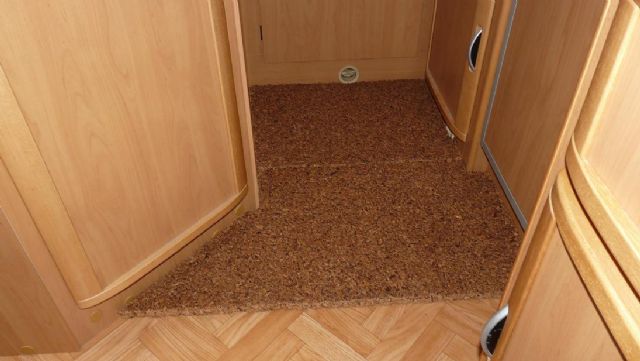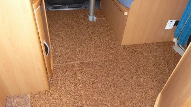 Ho ritagliato con del cartone la sagoma del pavimento del camper, poi sovrapposta sul sughero ho tagliato i vari pezzi adattandoli bene ai mobili, terminata l'operazione ho cosparso i pannelli con una mistura di vinavil e acqua per evitare leggeri sbriciolamenti dei pannelli, una volta asciutti li ho posati sul pavimento, non ho messo adesivi perchè così incastrati non si muovono.