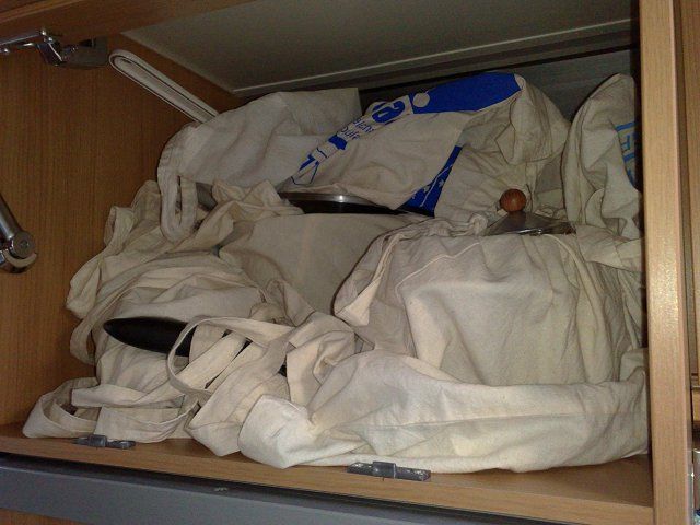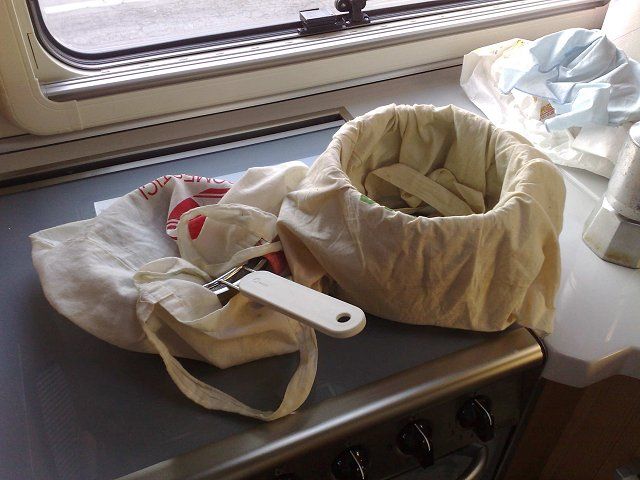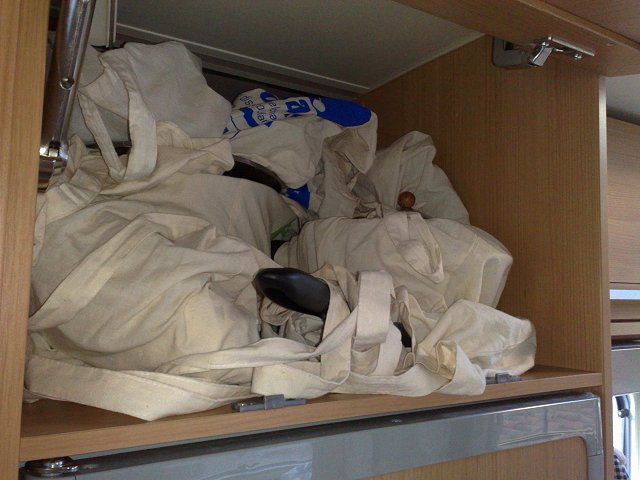In ogni borsa abbiamo inserito una pentola, e poi le abbiamo posizionate nel pensile del nostro camper. A questo punto qualsiasi vibrazione è stata scongiurata.