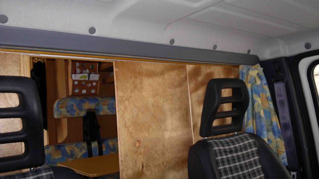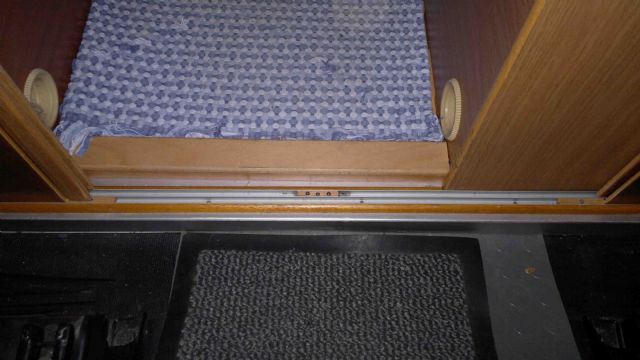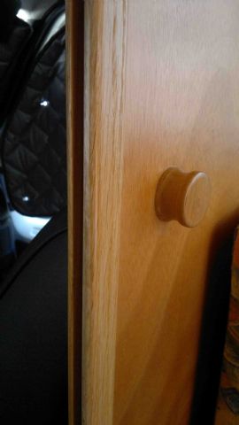Finalmente mi sono deciso a fare un lavoro più serio. Mi sono procurato quattro fogli di compensato marino da 8 mm (due da bloccare ai lati e due come porte scorrevoli) tagliati a misura, due guide in alluminio con due canali da 9 mm, listelli di legno da 10x30 mm, tondo di legno da 50 mm. Ho fissato le due guide sulla parte superiore ed inferiore del passaggio, la larghezza va da un montante all’altro. Su una porta ho applicato, sul lato di chiusura centrale, due listelli per formare un battente ad incastro per l’altra porta. Dal tondo di legno ho ricavato le due manopole, sporgenti dal lato cellula, a filo con incavo dal lato abitacolo. Le due antine esterne sono fermate da dei blocchi posti nelle guide. Un blocco analogo fa da fermo centrale alle due porte scorrevoli.