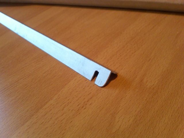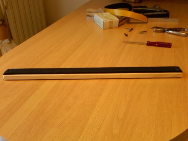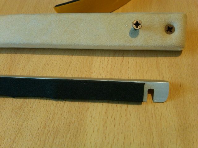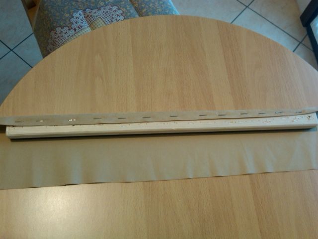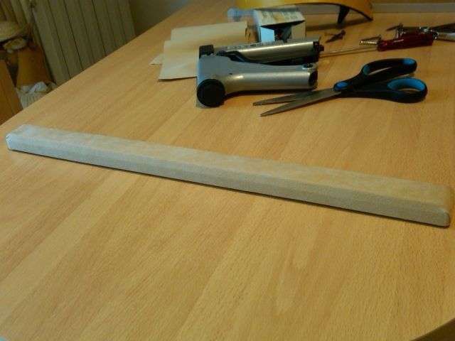 Con un pezzo di legno, gomma espansa adesiva, un pezzetto ad "L" di alluminio e della tela per rivestirlo ho realizzato questo semplice fermamestoli.