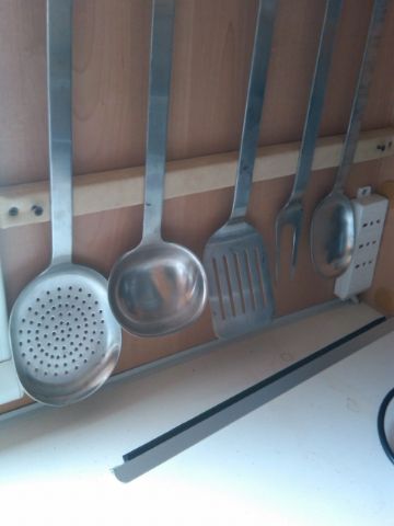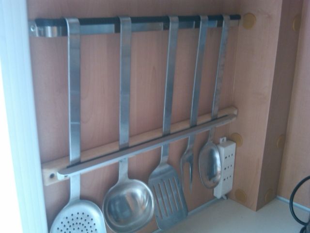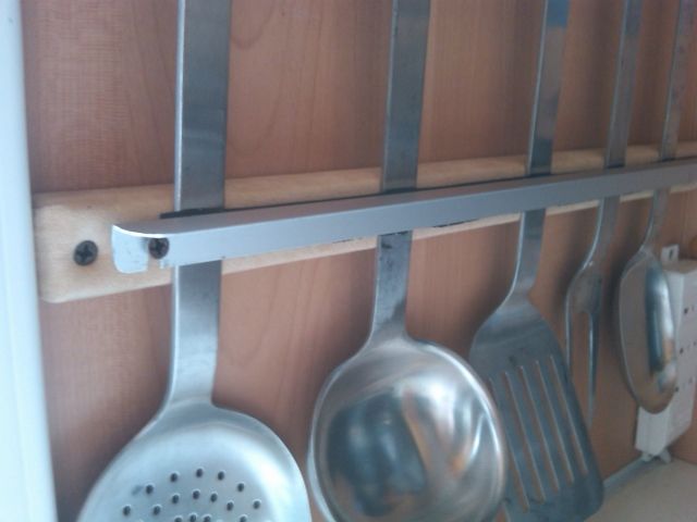 Per recuperare spazio e ridurre il rumore ho appeso i mestoli alla parete evitandone il movimento fissandoli alla base.