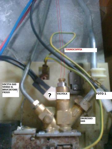 Nella foto si vede il gruppo valvola, la termocoppia (che avevo già rimosso) arriva col tubino disegnato in rosso contro la valvola magnetica, il gruppo contrassegnato con ? (nella foto) è quello che è collegato mediante i due fili elettrici neri al selettore, se il selettore viene spostato fa scattare la valvolina togliendo il delicato equilibrio elettromagnetico che la tiene aperta.