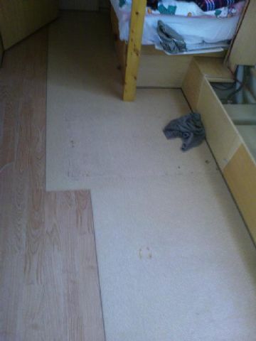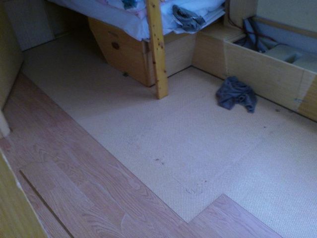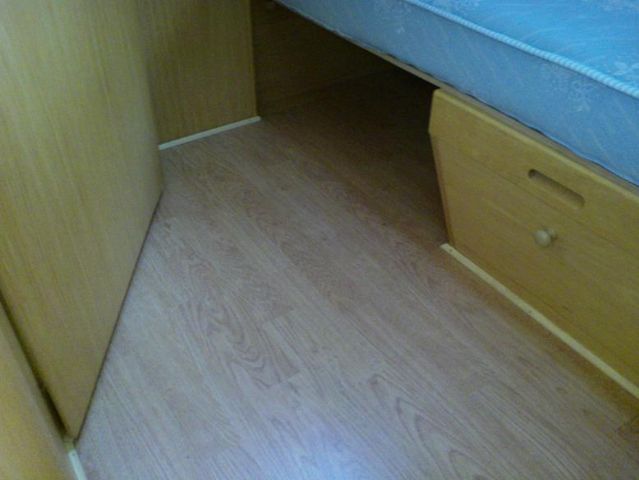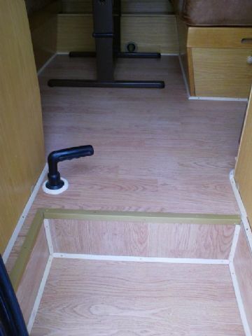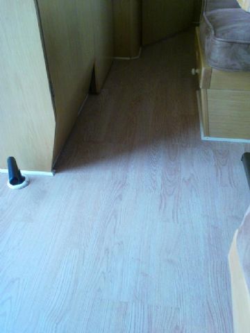 Appena acquistato il camper, già non mi piaceva il linoleum originale ed avevo optato per la moquette, molto costosa ma soddisfacente. Dopo cinque anni però, era un po' vecchiotta ed ho deciso di mettere giù il parquet, scopiazzando di quà e di là. Le prime tre foto sono del pavimento originale; le altre tre foto della lavorazione; mentre le ultime tre sono del lavoro finito. Costo: 30,00 euro di materiale e circa una ventina di ore di lavoro per le sagomature, visto anche che ho dovuto smontare le panche della dinette perchè non riuscivo ad incastrare bene i pezzi dopo sagomati.