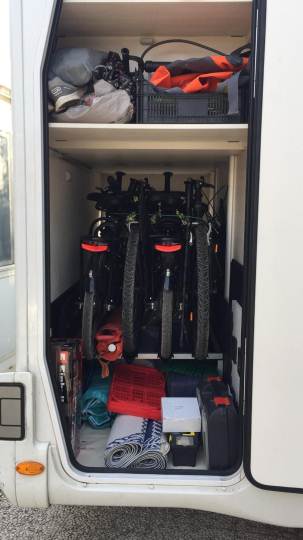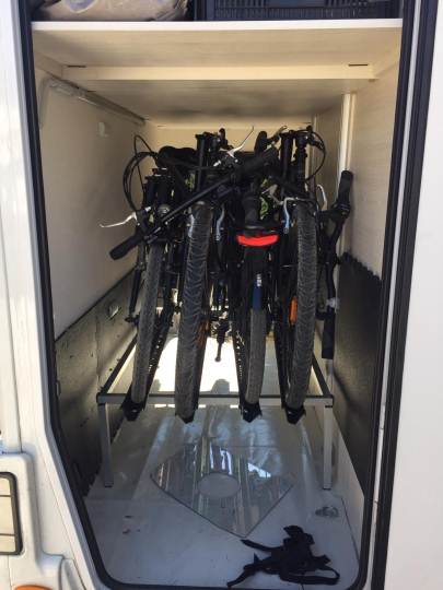 Io ho un camper con gavone da 150 kg di portata max: 3 bici ci vanno comode, ma mi serve che ne entrino 4; il problema è che a pieno carico per metterle e tirarle fuori è un delirio!