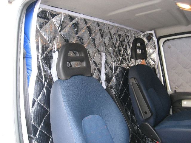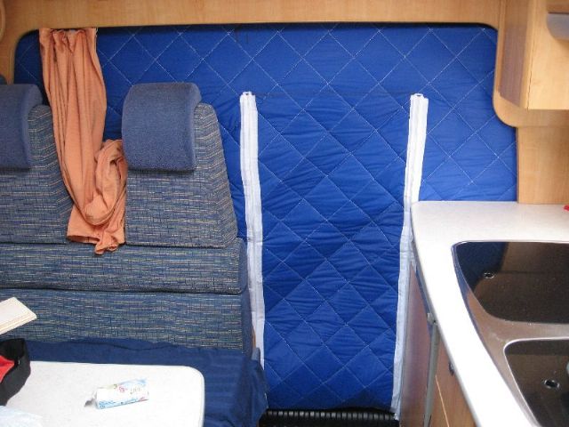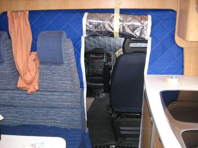 Per quello che riguarda la cabina, ho realizzato un divisorio utilizzando il foglio isolante 7 strati, sagomato a dovere e fissato tramite dei bottoni a pressione posizionati in vari punti del camper. In questo divisorio ho realizzato una porta apribile con cerniere in modo da poter entrare in cabina se ce ne fosse il bisogno. Il tutto è molto pratico da montare e smontare.