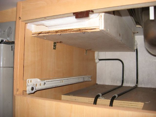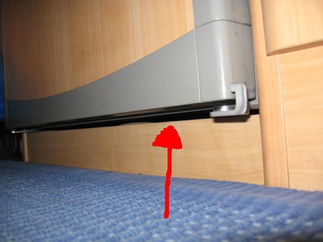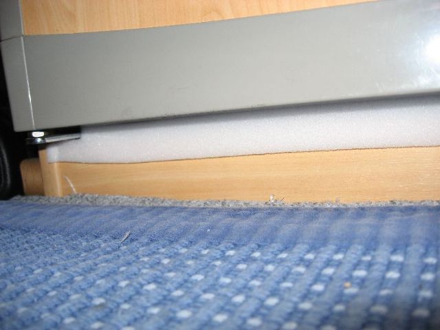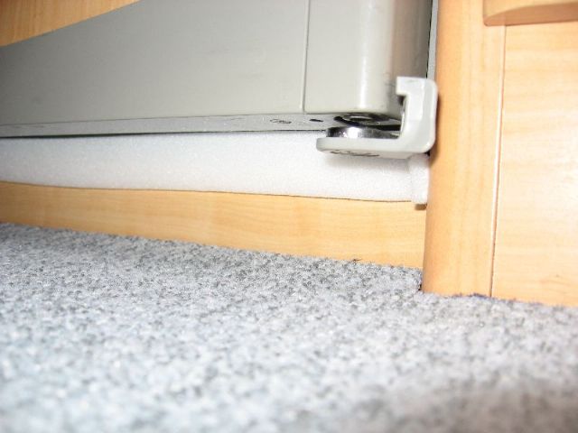 Per quello che riguarda gli spifferi, entrava la bora da una fessura sotto il frigo spessa un 1 cm e da dentro la cassettiera posizionata proprio sotto il pc e di fianco al frigo, perchè c'era la griglia per l'arezione proprio li vicino. Sotto il frigo ho incollato una striscia di spugna adesiva alta 3 cm, quelle che si usano per gli infissi di casa, mentre dietro la cassettiera ho realizzato una chiusura con dei pannelli in multistrato, pazientemente sagomati, e fissando all'interno una lamina di acciaio per evitare il contatto dell'eventuale calore con il multistrato. Ora non entra più un filo d'aria.