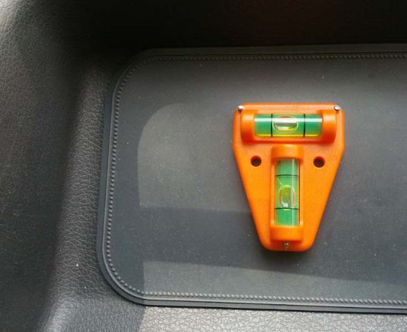 A questo punto, quando mi serve, appoggio la bolla sul portaoggetti, metto i cunei per terra e ci salgo sopra fino a quando sono a bolla (o quasi), senza alzarmi dal sedile di guida. Quindi mi fermo, spengo il motore, metto via la bolla ed è fatto!