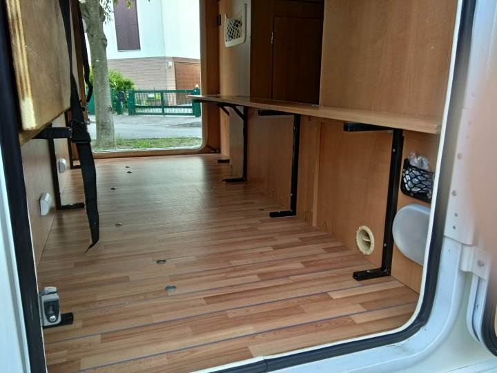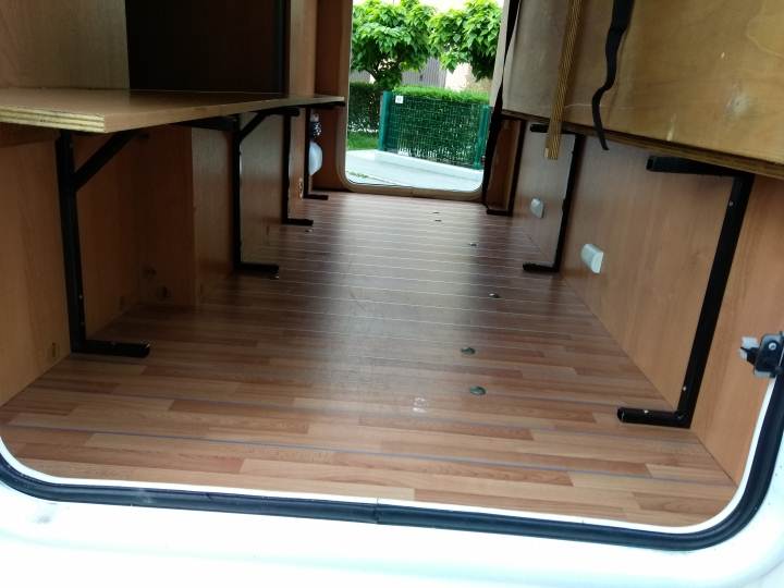 Nel mio camper, ho i due letti a castello in fondo, e sotto a quello inferiore c'è un piccolo garage.