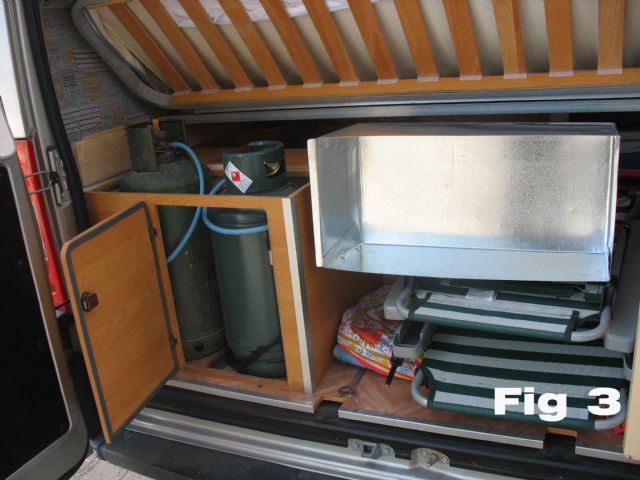 Ho poi provveduto alla sostituzione della originale chiusura superiore del vano bombole, (costituita in originale dal coperchio-asse di legno visibile in una foto poggiato su uno sdraio) costruendo il coperchio in acciaio sagomato a scatola, in modo che all’interno del suo rilievo ci fosse lo spazio sufficiente per alloggiare le due bombole di gas da 10 kg cadauna, arrivando col nuovo coperchio chiuso del vano, appena sotto le doghe del letto, senza toccarle.