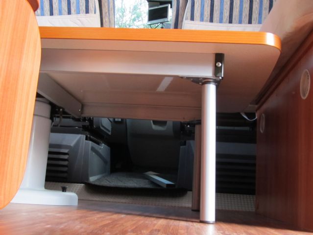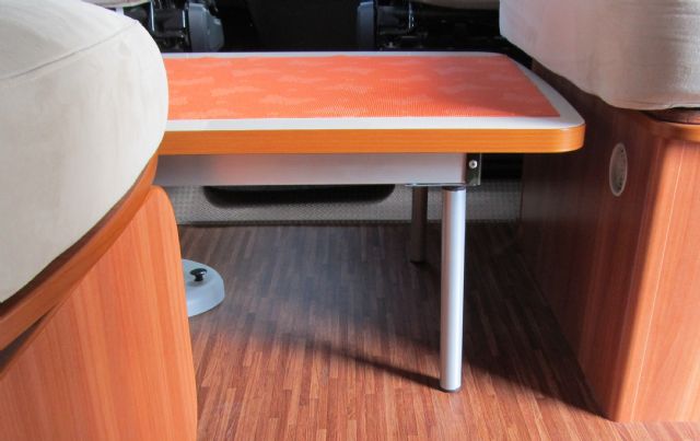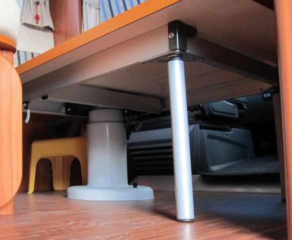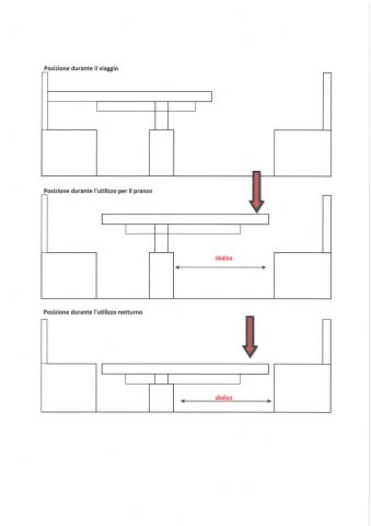 Ho pensato di rendere più stabile nella posizione notturna, il tavolo monogamba della dinette, in quanto traslandolo e posizionandolo al centro delle due sedute, il tavolo rispetto alla monogamba che lo sostiene, rimane sbilanciato da un lato (dx), con conseguenti cigolii la notte e rischi di rottura dovute al “momento flettente” che si viene a generare a seguito della posizione assunta.