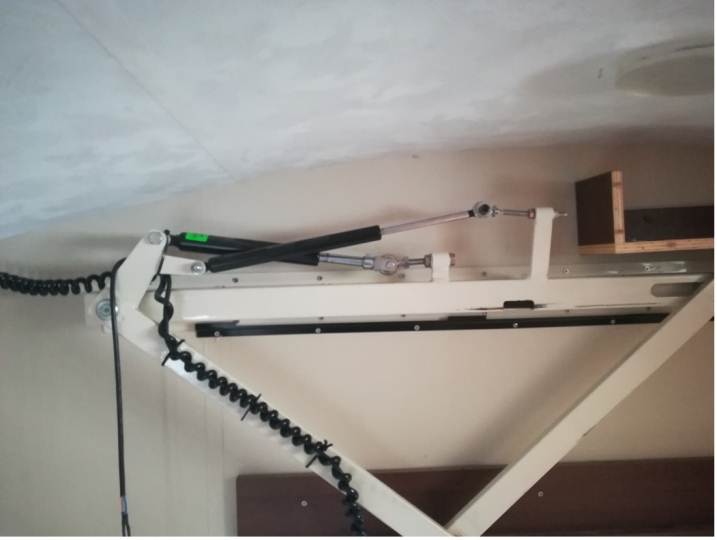 Prima di tutto bisogna togliere i vecchi pistoni, questi hanno però ancora una forza tale che non ne consente lo smontaggio: bisogna allora smontare l’asta collegata ai pistoni dalla struttura letto (il centro della X del pantografo e l’attacco in basso alla struttura del letto), prima va sorretto il letto con delle cinghie a cricchetto che passano sotto al letto e fissate alla struttura metallica ancorata alle pareti, questo consente di sganciare uno dei 4 punti di fissaggio del letto e poterci salire sopra per operare sui pistoni. Una volta sganciato il braccio del pantografo (un lato alla volta!) e alzandolo si liberano i pistoni per lo smontaggio, si può ri-fissare ora il braccio del pantografo alla struttura letto.