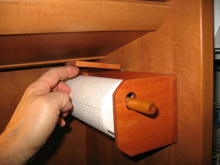 Il problema che si presentava a questo punto era che durante il viaggio la bobina si svolgeva da sola lasciando una montagna di carta dentro al lavello. Ho pensato quindi di fissare un'altra tavoletta di legno con una cerniera sulla parte superiore, questa tavoletta per il peso proprio fa un leggero attrito sulla bobina impedendo lo svolgimento accidentale della stessa.