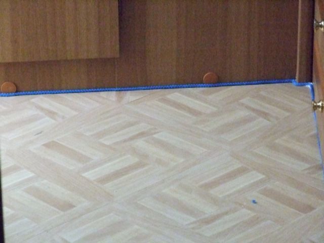 Ho usato delle piastrelle autoadesive e mi sono armato di tanta pazienza e cartoncino per fare le sagome di tutti i vari angoli del camper, visto che le pareti dei mobili non sono parallele tra loro e che gli spigoli dei mobili sono tutti stondati.