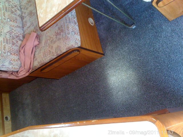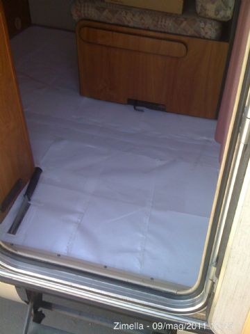 Per prima cosa ho deciso di fare la copertura completa del pavimento (prima c'erano delle corsie). Dopo ever pulito e sgrassato bene abbiamo (mia moglie ed io) fatto la "dima" del tappeto con fogli di stampante, nastro e pazienza. Abbiamo comprato moquette a metri con base gommata (di quella per i camminamenti degli alberghi, per intenderci) e abbiamo posizionato la dima (putroppo l'altezza era solo di un metro, quindi abbiamo dovuto fare delle aggiunte le quali, peraltro, a lavoro finito si notano pochissimo). Taglierino tipo "cutter" (attenzione che è pericoloso), un pezzo di battiscopa per andare dritti, pazienza e attnzione. Il gioco è fatto. Noi siamo molto soddisfatti. Con gli sfridi ci siamo ricavati dei tappetini per la cabina e l'entrata in camper. Spesa complessiva: 95 euro (praticamente solo il tappeto)....carta, nastro, forbici, pennarelli... ecc. li avevamo in casa.
