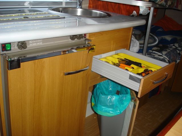 • Piano cottura + lavello profondo 18 cm (modello preso in prestito dall'arredamento delle cucine tradizionali ) + 2 cassetti Blum + anta per pattumiera