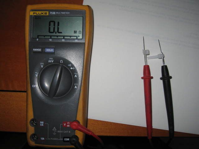 Ho fatto delle prove con un pezzo di legno: con un minimo di umidità la resistenza si abbassa rapidamente dal valore infinito a 2-3 mohm; in presenza di umidità la distanza fra i due puntali non ha particolare importanza, cioè la misura fatta con i puntali ad 1 cm di distanza o a 4-5 cm la misura varia di pochissimo, ovviamente finchè rimangono entrambi nella zona umida, per questo non ho ritenuto necessario realizzare un supporto per tenere i puntali alla stessa distanza; occorre solo fare attenzione infilando i puntali inclinati che non vadano a toccarsi, ma in questo caso la resistenza precipita a 0 ohm, qundi è facile accorgersene.