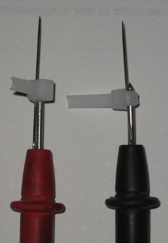 Visto l'ottimo funzionamento in una fase successiva ho migliorato il sistema procurandomi una coppia di puntali di scorta e saldando i due spilli alla punta con un normale saldatore a stagno; così facendo si evita in particolare che estraendo i puntali dalla parete si sfilino dalle fascette e rimangano incastrati nella parete, ma il sistema funziona bene anche con le fascette.