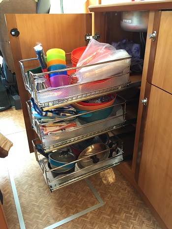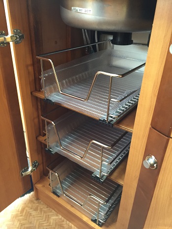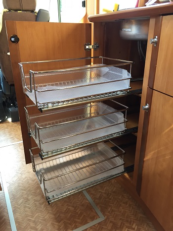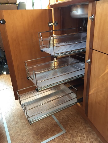 Ho quindi fissato i 3 cestelli, uno per ciascun ripiano più uno sulla base del mobile. Il risultato mi sembra ottimo e anche mia moglie è rimasta molto soddisfatta. Finalmente tutto è ordinato al suo posto e si riesce facilmente a recuperare anche gli oggetti in fondo al cassetto. Il fatto che le gambe dei ripiani arrivino anche fino al top della cucina serve per esercitare il contrasto necessario quando i cestelli sono completamente estratti.