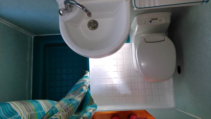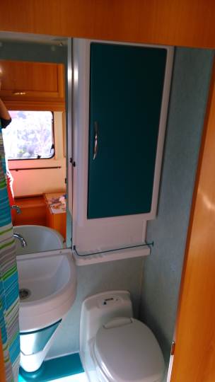 Ho acquistato delle vernici poliuretaniche 2 componenti. Passato una paglietta sulle superfici di plastica e un primer per plastiche. Scelto due colori. Un ral 5020 ed un bianco. Verniciato i mobiletti con pistola e il pavimento a rullo. Cambiato tenda e tolto qualsiasi accessorio.