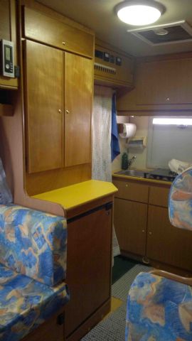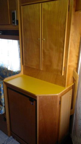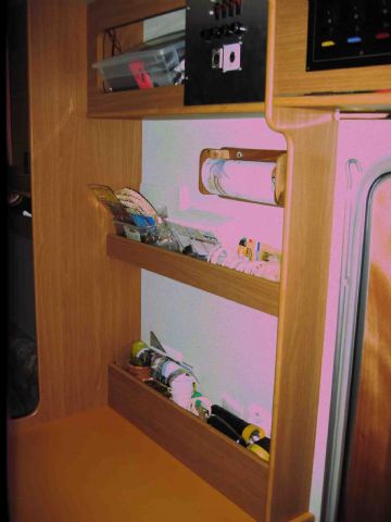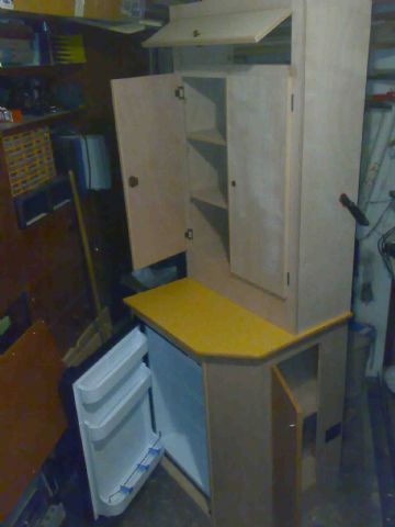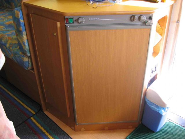 Il mio vecchione, Bussola Mobilvetta del 1999, aveva il frigo che non andava più. Sinceramente non mi aveva mai soddisfatto, poco capiente e critico con alte temperature, quindi ho deciso di cambiarlo. Dopo una ricerca in rete, ho deciso per un frigo a compressore, precisamente un Vitifrigo da 130 l, capacità quasi doppia, insensibile alle temperature esterne con misure leggermente diverse. Per posizionarlo nel camper ho dovuto comunque rivoluzionare il mobile, ricavando, al posto di due mensole portaoggetti che si trovavano sopra il frigo, un piccolo armadietto (per la gioia di mia moglie) con sopra uno scomparto per dispositivi elettronici.