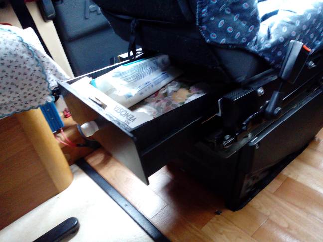 Dal momento che sotto al sedile c'era spazio ho pensato di sfruttarlo con due cassetti di forma particolare per riporre oggetti da tenere a portata di mano.