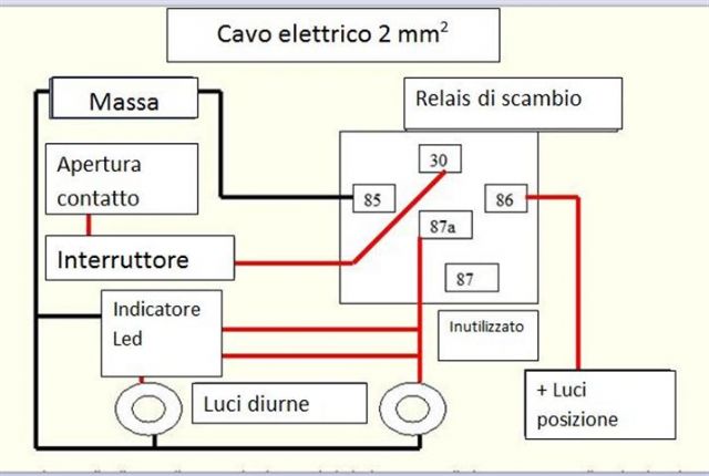 Quindi occorre collegare i positivi ed i negativi dei led in maniera da ottenere un solo cavo che andrà allacciato al relais con dei faston. Prelevare un positivo sotto chiave nella scatola fusibili del vano motore e collegarlo al faston 30 (per chi volesse potrebbe interporre anche sotto interruttore). Il positivo dei led va al morsetto 87a, la massa al morsetto 85 ed infine le luci di posizione al morsetto 86. (foto 5)