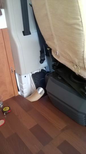 Ho deciso quindi di spostare nella zona anteriore il tubo del riscaldamento che finiva in bagno per fare questo ho lavorato sotto al divanetto della dinette e dentro alla botola che c’è sotto al tavolo,