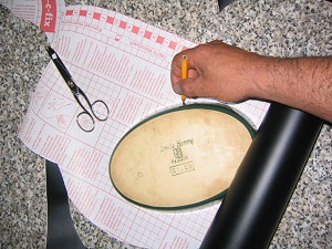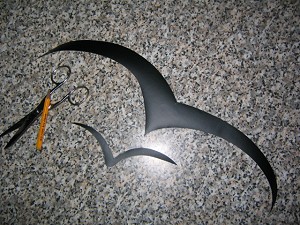 La soluzione e la realizzazione Ho acquistato mezzo metro di pellicola adesiva di color nero presso il colorificio sotto casa, costo € 1.2. Con una pirofila presa in prestito dalla cucina di casa, ho tracciato delle forme di gabbiani silouette in volo, ritagliati ed applicati. Ecco le foto dell’intervento: