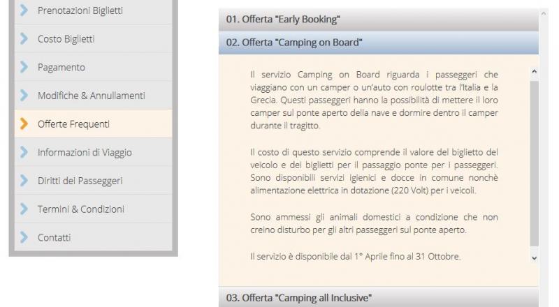 Non capisco questa sorpresa e lo stampare perché non si sa mai ... Per la Grecia è sempre esistito (almeno da Ancona e da Bari) con la Anek ma anche con BluStar, Superfast (ora consociate), Minoan, Venturis, ecc. il CampingOn Bord con i servizi che sono citati (attacco elettrico, servizi, docce, ecc.). In tutti i viaggi che ho fatto per la Grecia non mi è mai capitato di non poterli utilizzare (in particolare l'elettricità e le docce), forse una volta con la Venturis da Bari, arrivata in ritardo, ripartita in super ritardo, per far prima non hanno pulito e lavato i bagni, ti lascio immaginare lo stato dei servizi in tutta la nave; forse è stata l'ultima volta che sono andato con la Venturis da Bari, dopo sempre Anek e Superfast da Ancona e anche da Bari.