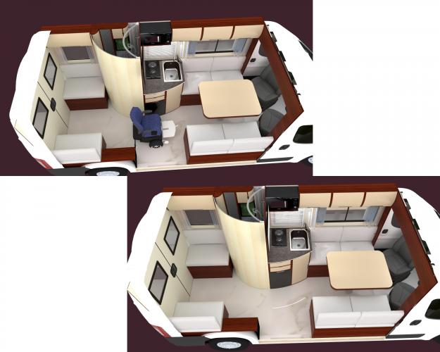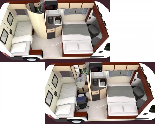 Ciao ecapalbo,bel progettino. Interessante la zona anteriore con doppio divano/letto,da ponderare bene pero' su un furgonato,data la presenza del portellone scorrevole,che di fatto sarebbe poco utilizzabile.Pero' riducendoil divano lato portellone,da due a un posto pranzo,avresti la quadra. Non mi ' chiaro se prevedi l'uso per una coppia piu' una terza persona,o solo due,compreso la persona disabile. Nel caso di due persone,compreso chi usa la carrozzina,toglierei il letto posteriore,per posizionare quando non in uso,la carrozzina,che altrimenti impedirebbe a tutti l'uso del bagno.(sempre ragionando di carrozzina elettrica,come da disegno) Nel caso di carrozzina pieghevole,nessun problema,la posizioni dove vuoi. Nel bagno,hai posizionato il wc con retro verso il frigorero.O si tratta di un wc nauticocon scarico ad un serbatoio esterno sotto il pianale,o quello a cassetta non lo puoi posizionare li,in quanto non potresti estrarre la cassetta.Alternativa,potrebbe essere il Porta Potti,semovente e quindi no problem. La pedana di accesso,immagino sia esterna,tipo quella che usano i camion,non quelle che si usano sulle auto,che vengono montate all'interno,che impedirebbe l'uso della zona posteriore per almeno 20 cm.(verifica bene le misure) Anche io come ti hanno gia' detto,lascerei perdere la porta aggiuntiva,complicata da fare,e porta via un sacco di spazio. Ovvio che é solo il mio punto di vista,ho avuto esperienza con una persona disabile,e usao da anni il camper. Ciao Eta Beta