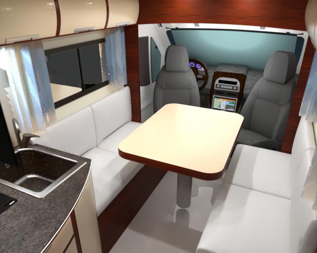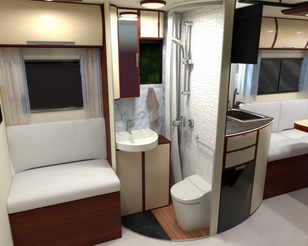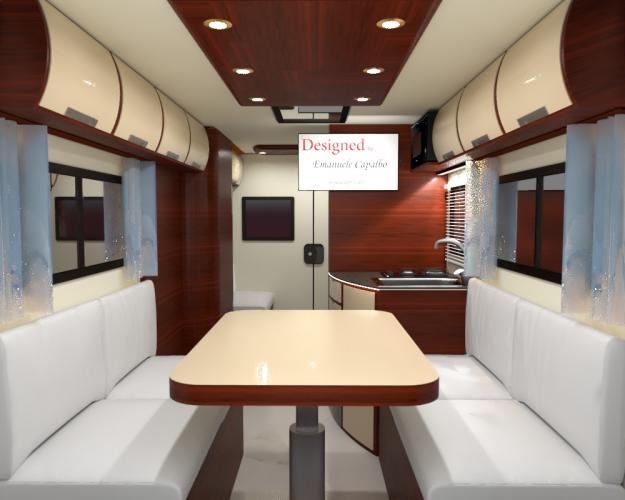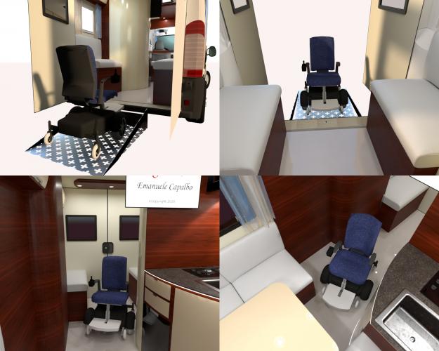 grazie per la risposta! ho usato sketchup con plugin Vray per renderizzare. si il camper è per disabili e mi sono inspirato al challenger 270... per il bagno, essendo ad angolo ed aperto, una volta spalancata la porta asoffietto, tutta la zona posteriore diventa bagno. la sedia a rotelle può benissimo accostarsi lateralmente al water o di fronte al lavandino (ci vorrebbe una tendina che divida il salotto-cucina).. secondo te un L2H2 potrebbe contenere tutto questo? ho preso le misure su internet ma vedendo i furgoni dal vivo ho il sospetto che siano meno capienti del mio progetto