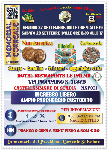 Buongiorno, siamo lieti di comunicarvi le date del prossimo appuntamento numismatico, filatelico e collezionistico, che si tiene dal 1994 a Castellammare di Stabia, il tradizionale raduno Memorial Correale.
