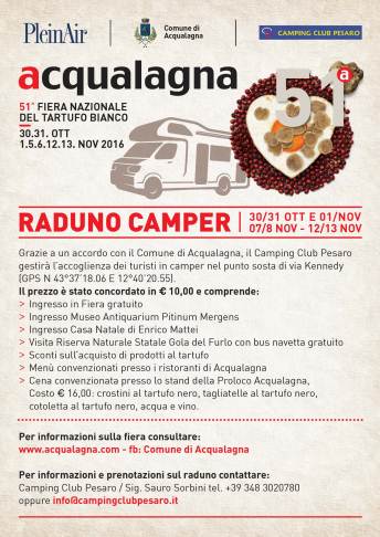 ACQUALAGNA ( PU ) - 51 FIERA NAZIONALE DEL TARTUFO BIANCO 30.31 ottobre 1 novembre - 5.6 novembre - 12.13 novembre 2016 RADUNO CAMPER Grazie a un accordo con il Comune di Acqualagna, il Camping Club Pesaro gestiràl'accoglienza dei turisti in camper nel punto sosta di via Kennedy (GPS N 43°37'18.06 E 12°40'20.55). Il prezzo é stato concordato in €10,00 e comprende: > Ingresso in Fiera gratuito > Ingresso Museo Antiquarium Pitinum Mergens > Ingresso Casa Natale di Enrico Mattel > Visita Riserva Naturale Statale Gola del Furto con bus navetta gratuito > Sconti sull'acquisto di prodotti al tartufo > Menù convenzionati presso i ristoranti di Acqualagna > Cena convenzionata presso lo stand della Proloco Acqualagna, Costo € 16,00 con il seguente menù: crostini al tartufo nero, tagliatelle al tartufo nero, cotoletta al tartufo nero, acqua e vino. Per informazioni sulla fiera consultare: www.acqualagna.com - fb: Comune di Acqualagna Per informazioni e prenotazioni sul raduno contattare: Camping Club Pesaro / Sig. Sauro Sorbini tel. 348 3020780 oppure info@campingclubpesaro.it PROGRAMMA DOMENICA 30 OTTOBREH. 10.30 / TEATRO A. CONTI Cerimonia di inaugurazione 51^ Fiera Nazionale del Tartufo Bianco, con la presenza del vice Ministro alle Politiche Agricole Andrea Olivero. H. 11.00 / DIGA DEL FURLO Centrale Aperta visita guidata alla diga del Furlo H. 16.30 / SALOTTO DA GUSTARE COOKING SHOW Chef Alessandro Borghese Abbinamento piatto-vino a cura di Consorzio Vini Piceni. Tartufo offerto da Urbani Tartufi. Costo 10 euro. Info e prenotazioni T. 333 1116908 A seguire Conferimento Ruscella d’oro. H. 17.30 / PIAZZA MATTEI Concerto “Le Rimmel” rock’n’roll al femminile. H. 18.30 / SALOTTO DA GUSTARE COOKING SHOW Chef Max Mariola Gambero Rosso Channel Ricetta: “Il Faraone di Acqualagna”. Petto di faraona, crema di pecorino, guanciale, erbe di campo e tartufo. Abbinamento piatto-vino a cura di Consorzio Vini Piceni. Tartufo offerto da T&C. Costo 10 euro. Info e prenotazioni T. 333 1116908 LUNEDI’ 31 OTTOBREH. 12.30 / SALOTTO DA GUSTARE COOKING SHOW Chef Stefano Ciotti ristorante Nostrano, Pesaro PU Ricetta: Calamari al testo, polveri mediterranee, tartufo e parmigiano 36 mesi. Abbinamento piatto-vino a cura di Consorzio Vini Piceni. Tartufo offerto da Acqualagna Tartufi. Costo 10 euro. Info e prenotazioni T. 333 1116908 H. 17.30 / PIAZZA MATTEI Concerto “Obelisco Nero” musica balcanica, klezmer, world music. H. 18.00 / SALOTTO DA GUSTARE COOKING SHOW “BUIO IN PADELLA” Chef Antonio Ciotola in collaborazione con UICI (Unione Italiana Ciechi e Ipovedenti Onlus – sezione PU). Ricetta: Casatiello napoletano al tartufo di Acqualagna. Scaloppina di rombo al profumo di tartufo su brunoise di pachino e olive strinate. Abbinamento piatto-vino a cura di Consorzio Vini Piceni. Costo 10 euro. Info e prenotazioni T. 333 1116908 MARTEDÌ 01 NOVEMBREH. 09.00 / BOCCIODROMO COMUNALE Gara Nazionale di bocce “43^ Trofeo del Tartufo”. H. 09.00 / PIAZZA MATTEI 3° raduno Moto club Ducati, Pesaro e Urbino. H. 10.00 / TEATRO A. CONTI PRESENTAZIONE LIBRO “Il Vaccino non è un’opinione” di Roberto Burioni, medico Ordinario di Virologia e Microbiologia all’Università San Raffaele di Milano. A seguire approfondimento e dibattito sull’argomento. H. 12.30 / SALOTTO DA GUSTARE COOKING SHOW A cura dell’ Associazione Professionale Cuochi Italiani. Abbinamento piatto-vino a cura di Consorzio Vini Piceni. Costo 10 euro. Info e prenotazioni T. 333 1116908 H. 15.30 / TEATRO A. CONTI Concerto Accademia Musicale Acqualagnese. H. 16.00 / MUSEO ARCHEOLOGICO ANTIQUARIUM PITINUM MERGENS Visita guidata del Museo a cura delle ragazze del progetto “Alternanza Scuola Lavoro”. H. 17.00 / SALOTTO DA GUSTARE PRESENTAZIONE LIBRO “Gli Aristopiatti, storie e ricette della cucina aristocratica italiana” con le autrici Lydia Capasso e Giovanna Esposito (2015, Guido Tommasi Editore-Datanova) H. 18.00 / SALOTTO DA GUSTARE COOKING SHOW ARISTOCRATICO Chef Ferdinando Beneduce e Rosaria Morganti. Ricette: Maccheroni al tartufo. Il caffè della contessa. Abbinamento piatto-vino a cura di Consorzio Vini Piceni. Tartufo offerto da Tartufi Rossi. Ingresso gratuito. SABATO 05 NOVEMBREH. 10.30 / SALOTTO DA GUSTARE SEMINARIO Bottega di Mestiere, “Tartufando. Cibo e Territorio in Tavola”. Lavorare nel settore enogastronomico: competenze e professionalità da formare, con la testimonianza dei protagonisti della Bottega di Mestiere accompagnata dalla degustazione dei prodotti delle imprese partecipanti. H. 15.30 / SALOTTO DA GUSTARE WELL FOOD “LE MANI IN PASTA” SCUOLA DI CUCINA PER BAMBINI. A cura dell’Associazione Professionale Cuochi Italiani. Ingresso gratuito, solo su prenotazione T. 333 1116908 H. 17.00 / TEATRO A. CONTI Incontro con il Prof. Giorgio Vittadini “Sussidarietà e…politiche industriali”. Rapporto sulla sussidarietà 2015/2016. Interviene Peter Aufreiter, direttore Galleria Nazionale delle Marche di Urbino H. 17.30 / PIAZZA MATTEI Concerto duo musicale “Davide Grilli e Daniele Ferri”. H. 18.00 / SALOTTO DA GUSTARE COOKING SHOW Chef Gianfranco Pulina ristorante Golden Gate, Bortigiadas OT Ricetta: Pane lentu, pecorino in varie consistenze, tartufo pregiato di Acqualagna. Abbinamento piatto-vino a cura di Consorzio Vini Piceni. Tartufo offerto da Urbani Tartufi. Costo 10 euro. Info e prenotazioni T. 333 1116908 DOMENICA 06 NOVEMBREH. 11.00 / PIAZZA MATTEI Raduno “Ferrari Club Pesaro” H. 12.30 / SALOTTO DA GUSTARE COOKING SHOW Chef Nikita Sergeev ristorante L’Arcade, Porto San Giorgio FM Ricetta: Minestra d’autunno Abbinamento piatto-vino a cura di Consorzio Vini Piceni. Tartufo offerto da T&C. Costo 10 euro. Info e prenotazioni 333 1116908 H. 15.30 / SALOTTO DA GUSTARE SFIDA IN CUCINA Ai fornelli due Grandi imprenditori del Territorio, accompagnati dai migliori chef Acqualagnesi. Luca Paolorossi, Sartoria Luca Paolorossi e Paolo Togni, AD Togni Spa. Presenta Federico Quaranta.