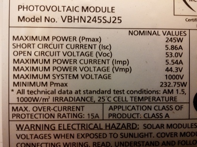 Fernando , prova a guardare nell'imballo originale , sono due porzioni di cartone che restano incastrati sui lati lunghi del pannello a protezione del suo telaio , la targhetta contiene un codice a barre con l'indicazionedella potenza di quel pannello , nulla ha a che vedere con i dati di targa che hai postato , dovresti ritrovartelo anche in fattura I produttori seri collaudano ogni singolo pannello e viene creato un Flash report , più comunemente chiamata Flash list Mar..cucciolo