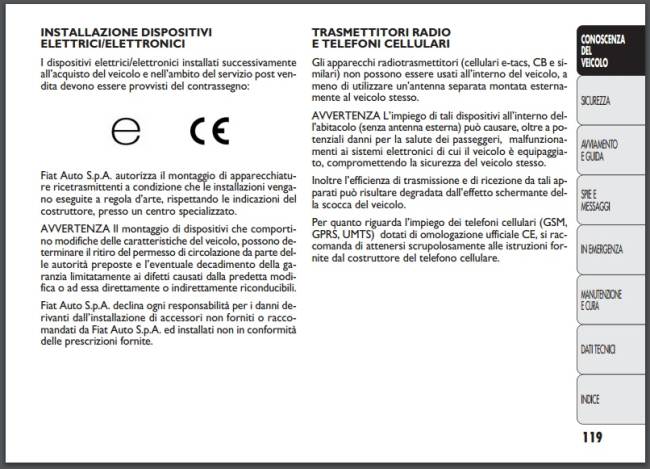 Ciao a tutti, argomento interessantissimo e come sempre preziosissimi consigli. Solo una cosa: nel manuale d'uso del ducato x250 c'è scritto di NON utilizzare apparati ricetrasmittenti in cabina pena possibili malfunzionamenti degli apparati elettronici di bordo. Vi riporto quanto indicato a pagina 119: Gianluca.