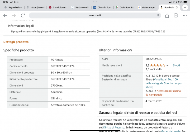 buonasera, è una giungla, per rimettere il bombolone a norma mi hanno chiesto 2500 euro, sto valutando di modificare l’alloggio del bombolone e mettere due bombole ricaricabili in alluminio, mi servirebbero le misure esatte da chi le ha, dovrebbero essere 30x60,5, visto che è un cilindro, le dimensioni dichiarate sono 30x30x60,5 grazie